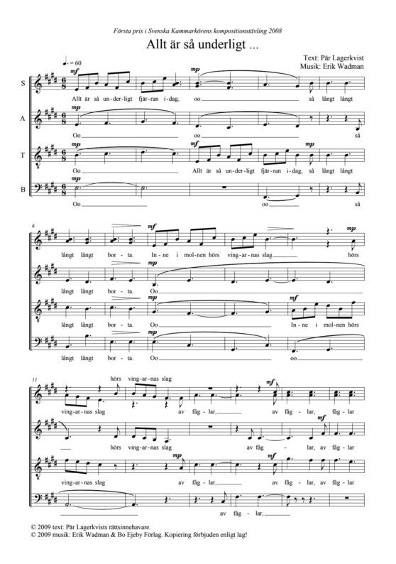 Våren 2008 utlyste Svenska Kammarkören en kompositionstävling. Det vinnande bidraget blev Erik Wadmans tonsättning av Pär Lagerkvists dikt Allt är så underligt, en sång i den klassiska svenska körlyrikens anda.