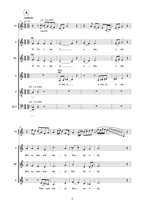 ”The lyrics of Ama were penned by Virgil and by Seneca the younger; influential Roman poets active two thousand years ago. Virgil is represented here by two stanzas: Amor vincit omnia et nos cedamus amori (Love conquers all things; let us too surrender to love) and Breve et irreparabile tempus omnibus est vitae (Lifetimes are brief and not to be regained), while Seneca’s contribution is Si vis amari, ama (If you want to be loved, love). Seneca was reputed to have corresponded with the apostle Paul.