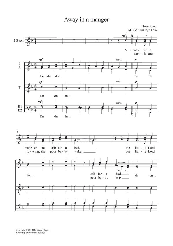 Well-known Christmas Carol lyrics in a new musical dress, and a delicious one! Beautifully arranged for two soprano soloists and mixed choir. The composer Sven Inge Frisk is a former church musician and teacher at Malmo Academy of Music.