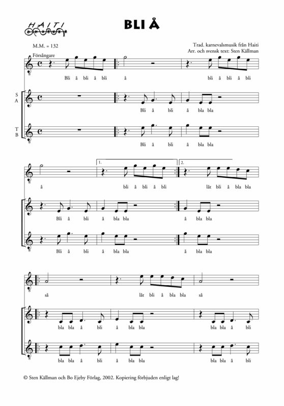 Traditionell haitisk musik i arrangemang för blandad kör och slagverk av Sten Källman. En sång ur Sångensemblen Amandas repertoar.