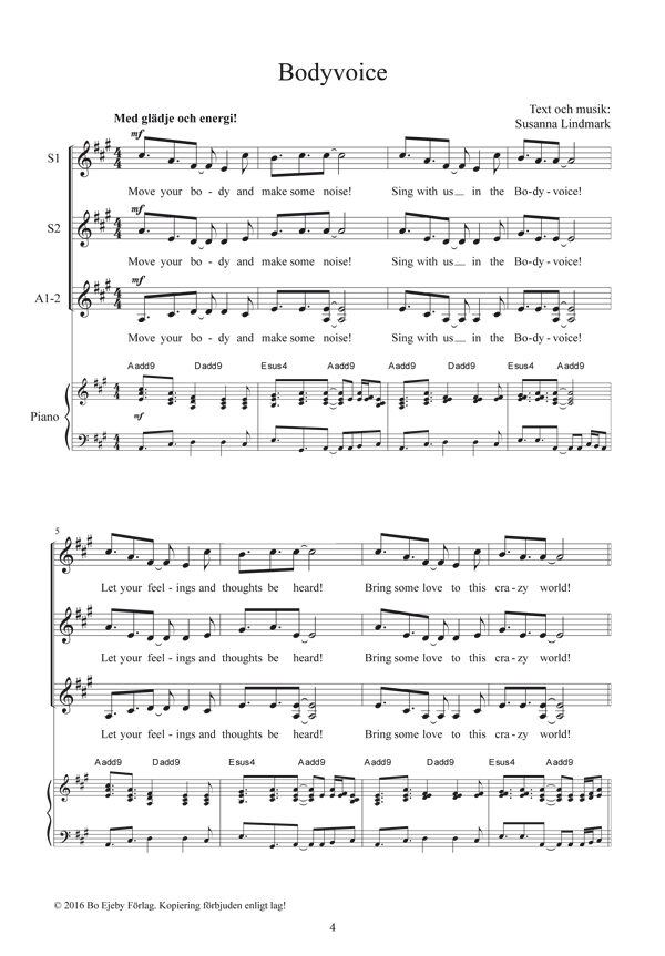 BODYVOICE is a song where you make your voice heard and get to unleash your body in movement. Create your own choreography with your choir or ensemble. The piano part is intended as a “skeleton” that the pianist can flesh out with their own creativity. If you feel like adding bass, percussion, and so on – go for it! – Susanna Lindmark