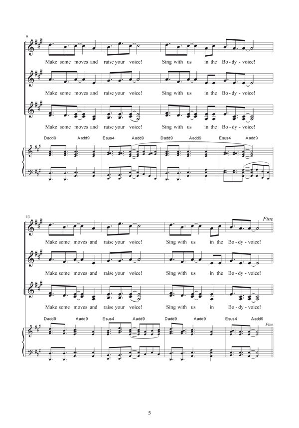 BODYVOICE är en sång där du får göra din röst hörd och släppa loss din rörelselust! Skapa gärna rörelser/koreografi tillsammans med din kör. Pianostämman är tänkt som ett skelett som pianisten kan utgå ifrån och sedan bygga på med sin egen kreativitet, och vill du bygga på ditt komp med bas, slagverk m.m. så är förstås allt möjligt! – Susanna Lindmark