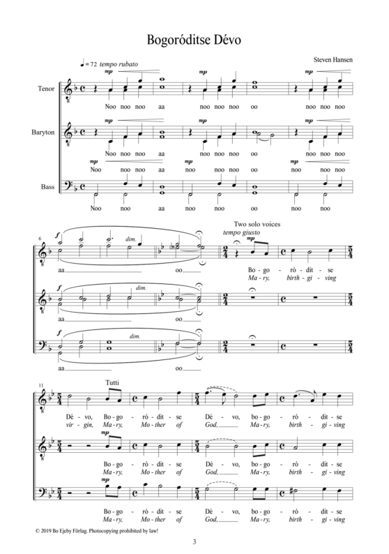 In connection with the publication of the piece, I made some minor adjustments and added an English translation of the lyrics. I also wrote a separate version for mixed choir SATB, available from Bo Ejeby Förlag.” – Steven Hansen