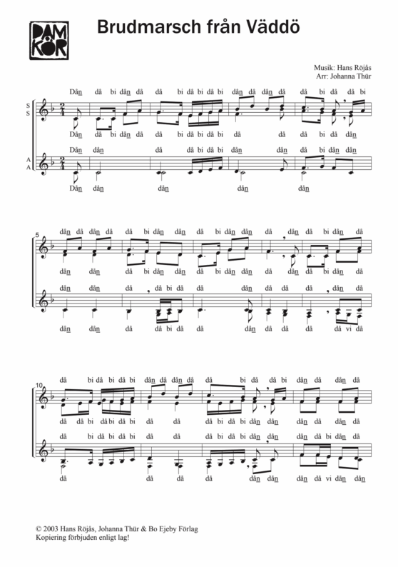 A traditional Swedish wedding marsch with no words, after fiddler Hans Röjås. Also available for mixed choir.