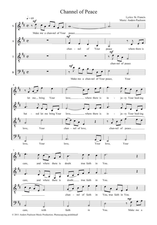 The peace prayer of St. Francis of Assisi in a beautiful and slightly contrapuntal style. Composition by Anders Paulsson, who is famous for his soprano saxophone career but who also is composing choral music.