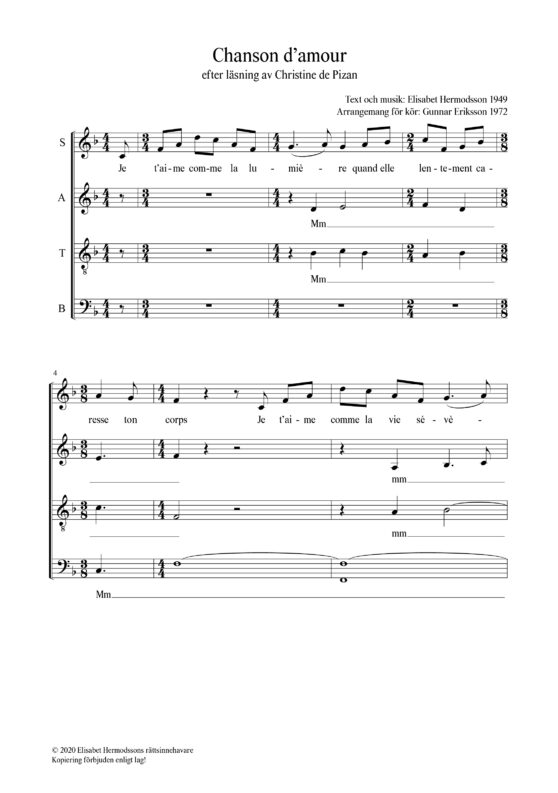 Någon gång runt 1950 skrev Elisabet Hermodsson denna kärlekssång – på franska. Gunnar Eriksson har arrangerat den för blandad kör.