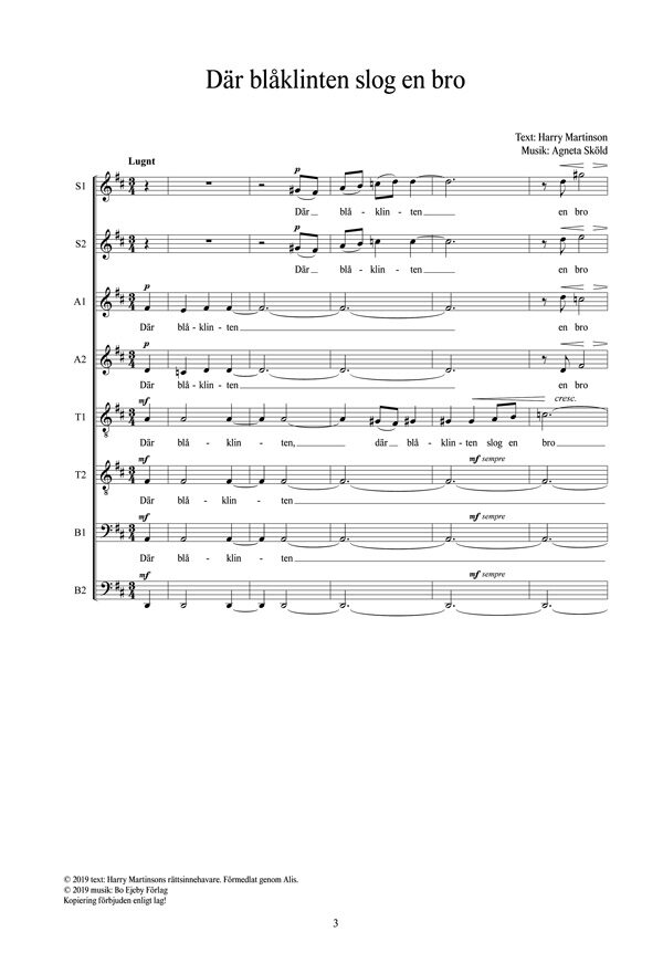 ”När jag läste Harry Martinsons dikt ’Där blåklinten slog en bro’ kom en bild av en dallrande het sommardag inför mig. Kände barndomsvibbar, den blå blåklinten i åkrarnas gula fält, känslan av mättnad, allt stilla. Och mitt i denna värme en annan passion, den mellan de två älskande. Dessa bilder gav sedan fart åt det musikaliska förloppet; det stillastående mot ett allt intensivare tillstånd.” – Agneta Sköld
