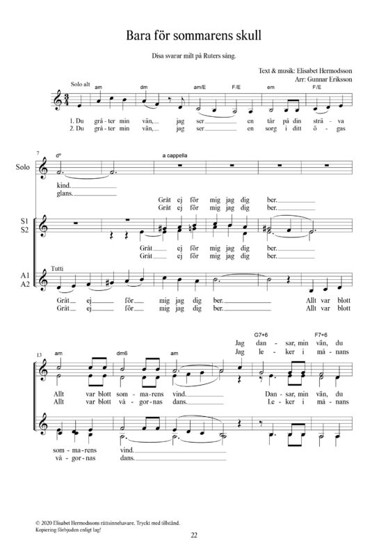 9 songs by Swedish writer, poet, composer and artist Hermodsson. She became well known in the 1970s for poetry inspired by second-wave feminism. These songs have been arranged for women’s choir by professor Gunnar Eriksson, and have a feminist and poetic message.