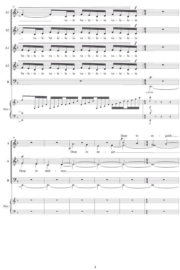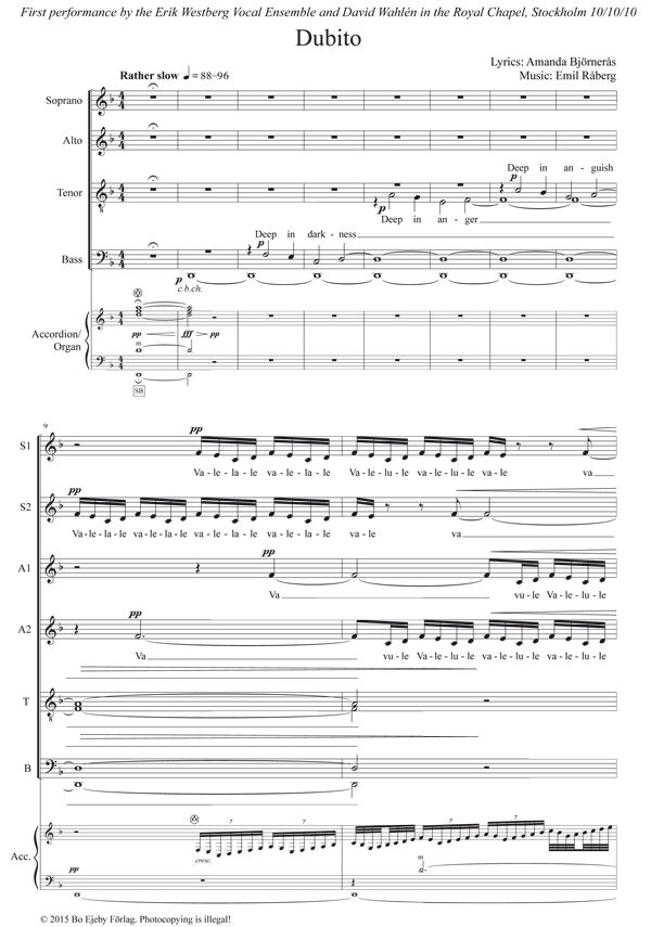 Emil Råberg’s great piece of music Dubito, for 8-parts mixed choir and accordion (alternatively organ), is based on lyrics by Amanda Björnerås. The text, which expresses doubts and worries is mixed with rapid syllables (possibly influenced by minimalistic compositions), ends with a prayer: ”Deep in the dark I pray: Be by my side, my Lord! Alleluia, alleluia!”