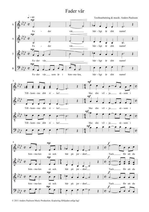 Bönen Fader vår i en lätt reviderad form av Anders Paulsson. Musiken kan närmast klassificeras som romantisk.