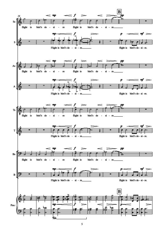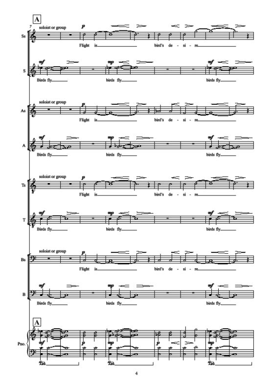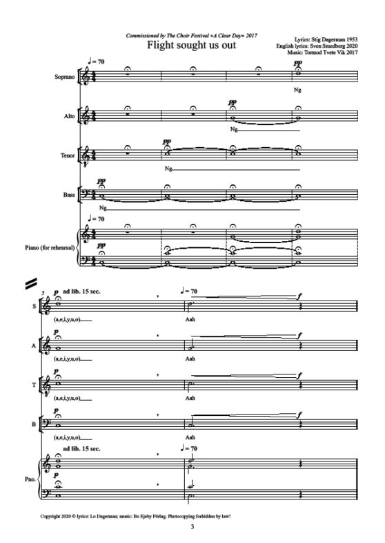 ”Flight sought us out is well-suited to choirs at different levels. This is a reduced version of the work for one SATB choir with a soloist or a small solo group in each part. The original version for three choir is also available.” – Tormod Tvete Vik