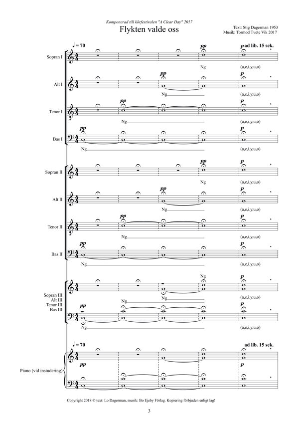 Flykten valde oss av norske Tormod Tvete Vik är ett suggestivt «vandrande körverk» för 3 körer SATB till Stig Dagermans text som först publicerades i samlingen Dagsedlar 1953. Texten berör ett ständigt aktuellt tema och gestaltas musikaliskt genom att nyttja körernas placering och rörelser i förhållande till rummets naturliga akustik.