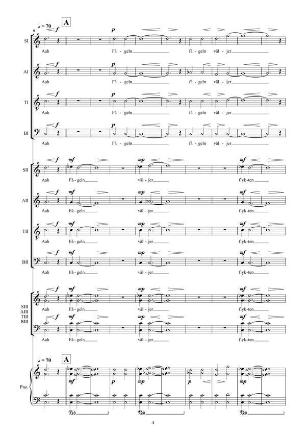 ”Flight is bird’s desire”. A piece with a strong message, that includes an optional simple kind of movement performed by the singers. An English version, Flight sought us out, is also available.