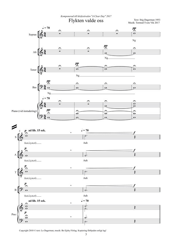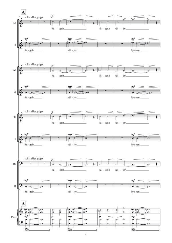 ”Flight is bird’s desire”. A piece with a strong message, that includes an optional simple kind of movement performed by the singers. An English version, Flight sought us out, is also available.