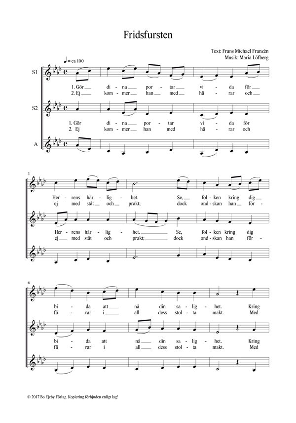 ”Gör dina portar vida för Herrens härlighet …” Motett för trestämmig damkör av kyrkomusikern och tonsättaren Maria Löfberg, verksam i Falkenberg.