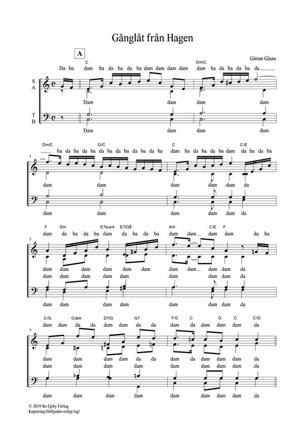 En glad gånglåt i folklig stil, med trallvänlig text. Kan sjungas både a cappella eller med komp (ackordanalys finns).