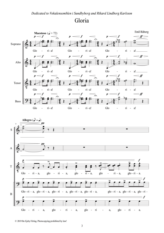 Tonsättaren Emil Råberg har karaktäriserat sitt Gloria som en körfanfar! Det är ett jublande Gloria som smattrar som av trumpeter.