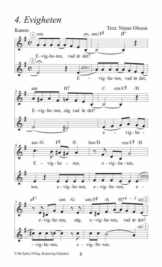 ”Good night, eternity!” 24 ”pocket-sized songs” in Swedish concerning life, death, love and eternity, the sea and the rainbow. To be sung alone, with friends, in canon, with a piano or perhaps a whole jazz ensemble.