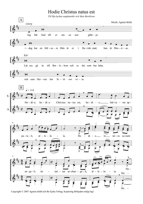 Julsång för damkör a cappella (och liturg ad lib), tillägnad Hjo kyrkas ungdomskör och Mats Bertilsson. Text på latin, översättning till svenska och engelska. Musik av Agneta Sköld.