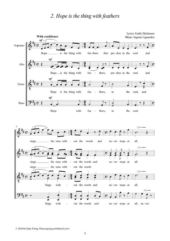 Two poems by Emily Dickinson – ”If I can stop one heart from breaking” and ”Hope is the thing with feathers” – put to music for mixed choir by Ingunn Ligaarden. The composer says: ”With these songs in these times of great uncertainty I wish you hope. Hope for your life, hope for your future.”