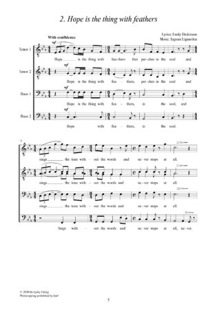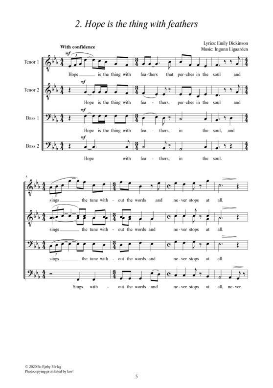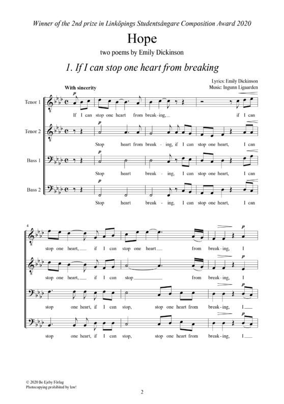 Two poems by Emily Dickinson – ”If I can stop one heart from breaking” and ”Hope is the thing with feathers” – put to music for male voices by Ingunn Ligaarden.