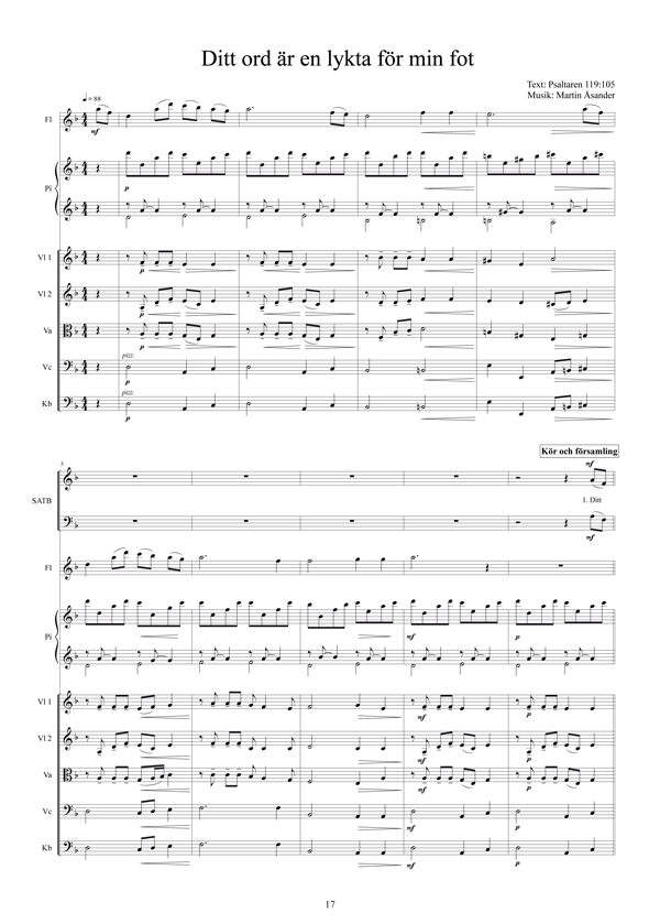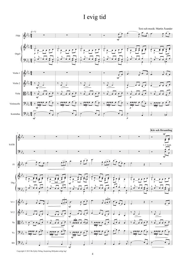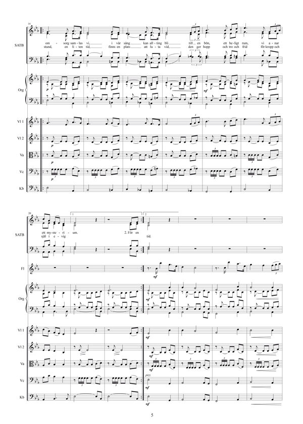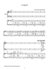 ”For eternity”. A mass consisting of both liturgical texts and words by the composer. Duration: ca 30 min. For mixed choir, flute, string quartet, double bass, organ, piano. Also for the congregation to take part.