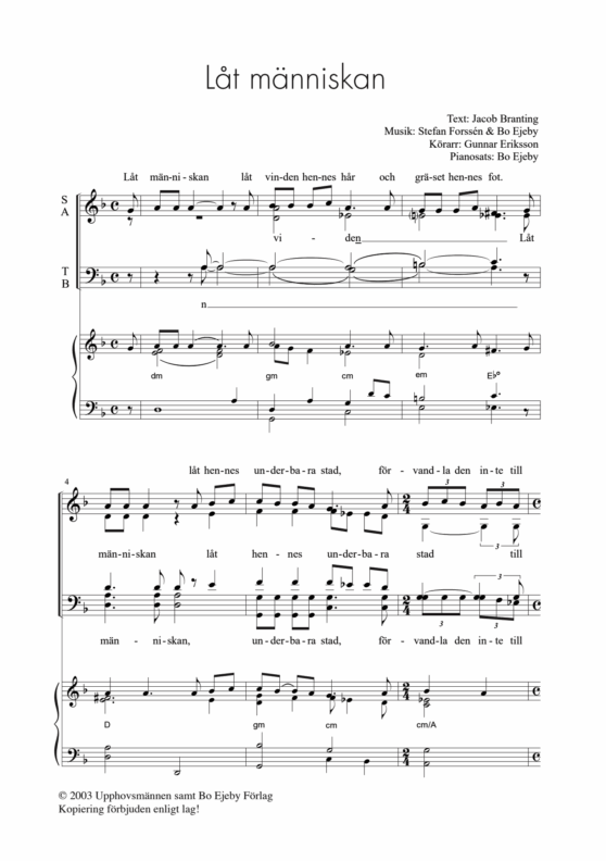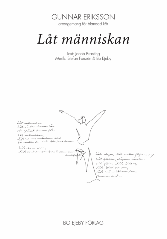 ”Let humanity”. A beautiful poem in an equally beautiful setting. The poem tells in an open way about our short life: ”Let us, let wind our hair and grass our feet … Let bread and wine, let human life, our one and only life.” The music is a cooperation between the jazz pianist Stefan Forssén, the publisher and choral singer Bo Ejeby and the conductor and arranger Gunnar Eriksson. There is also a version for women’s voices.