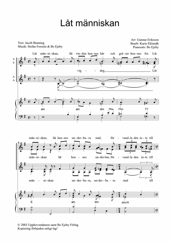 ”Let humanity”. A beautiful poem in an equally beautiful setting. The poem tells in an open way about our short life: ”Let us, let wind our hair and grass our feet … Let bread and wine, let human life, our one and only life.” The music is a cooperation between the jazz pianist Stefan Forssen, the choral singer Bo Ejeby and the conductor and arranger Gunnar Eriksson. Version for women´s choir by Karin Eklundh. A version for mixed choirs is also available.