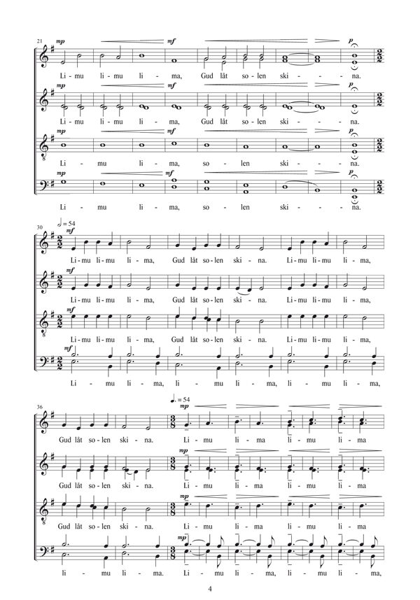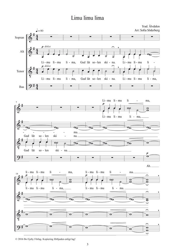 Limu limu lima is one the most wellknown traditional Swedish folk songs, originally possibly a medieval Maria hymn. The arrangement was originally written for the male choir Svanholm Singers, which is conducted by Sofia Söderberg. The male voice version has order no. 1279.