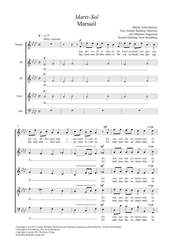 Three poems in Danish (and with a Swedish adaptation) telling about the time in March when darkness gives in to the light. John Hoybye is one of Denmark’s most well known choral conductors, arranger and composer of choir music.