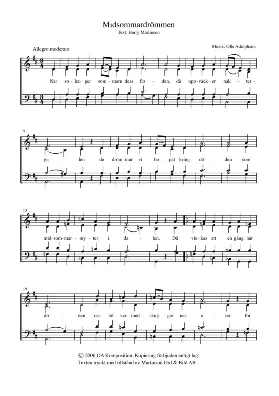”The Midsummer dream”. A summer hymn by popular Swedish composer Olle Adolphson, based on a poem by Swedish poet and Nobel Prize laureate Harry Martinson.