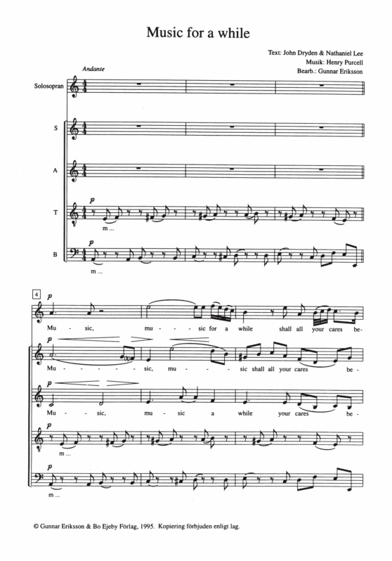 Maybe the most famous and most beloved song about the importance of music. Henry Purcell wrote his song for the tragedy Oedipus in 1678. The keyboard part of Purcells beautiful theatre music has been transcribed for a cappella choir with a solo voice by professor Gunnar Eriksson. Also available for women’s choir.