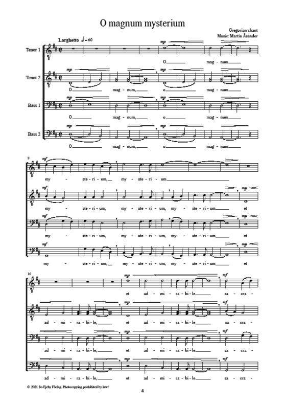 ”O magnum mysterium is a responsorial chant from the Matins of Christmas. I was searching for a text that would easily fit and be suitable for Christmastime and was lucky to find an old score that I had first started working on in 2013, originally in a men’s choir setting. I initially asked myself if the world needs yet another composition featuring this text about the Virgin Mary and the birth of Jesus, but after playing it through a couple of times, I was struck by the simplicity and purity in the music. I immediately started to edit the original score and also made a version for mixed choir, which I decided to dedicate to VoNo Vocals and their conductor Lone Larsen. O magnum mysterium is to be premiered in Tolosa, Spain, in the beginning of November 2021.” – Martin Åsander