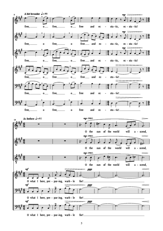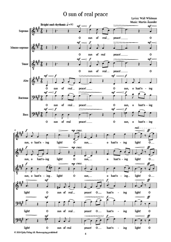 With its somewhat motet-like form for double choir, this piece can encourage the singers to explore new constellations, rhythmic swing and hopefully, the true joy of singing. The mezzo and baritone part may preferably be sung by a mix of altos/sopranos and tenors/basses respectively.” – Martin Åsander