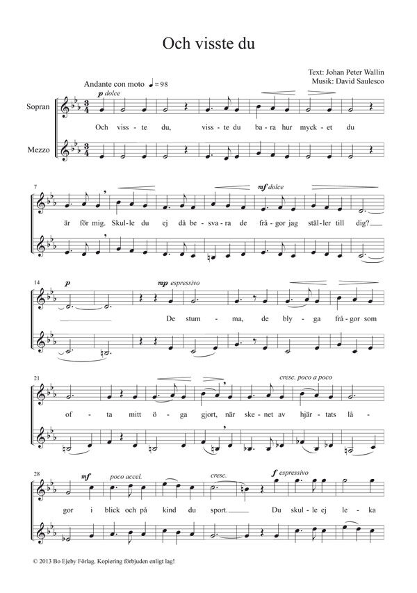 ”And did you only know”. Saulesco has taken this love poem full of emotion (yet not sentimental) and created an unadorned and elegant composition for two female voices (soprano and alto / mezzo) or women’s choir / treble choir.