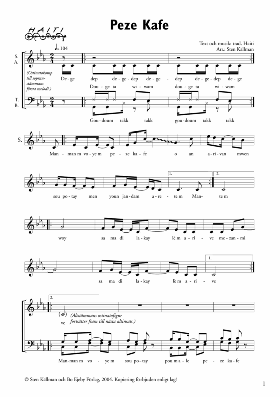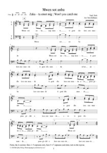 En traditionell visa från Haiti på kreol, i rytmiskt arrangemang för kör a cappella med slagverk ad lib av Sten Källman. Innehåller förslag till slagverksrytmer, textöversättning och uttalsnyckel.