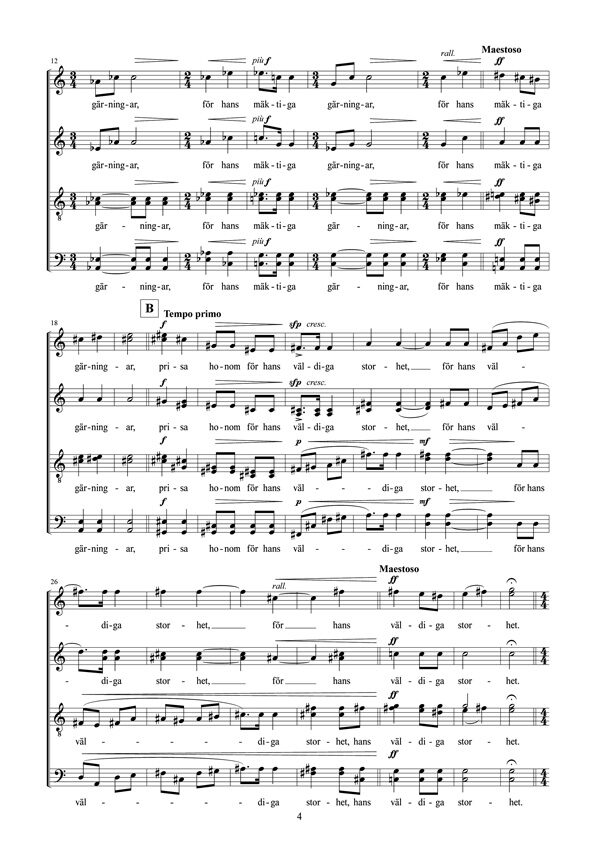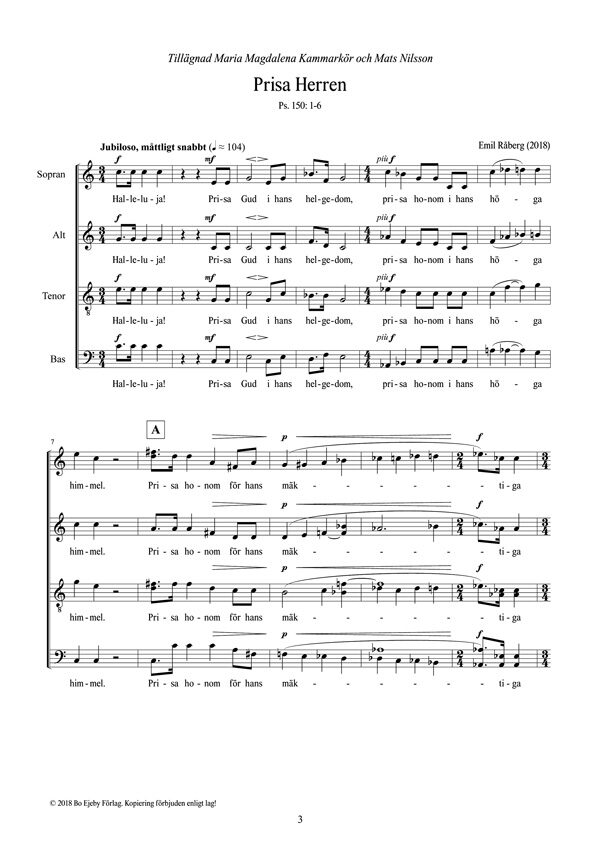”Praise the Lord”. A jubilant canticle from the Book of Psalms. ”Feel free to try to pick out the onomatopoeic expressions for each instrument in the text. I see every modulation, movement etcetera as a change of key signature, so that the music is constantly amplified as a single long crescendo.” – Emil Råberg