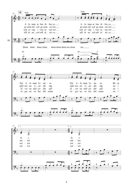 This steady and beautiful song grows with a crescendo, the percussion cautiously sneaking its way in, adding more power and feeling. Lyrics in Haitian Creole and Swedish. Rhythm score included.