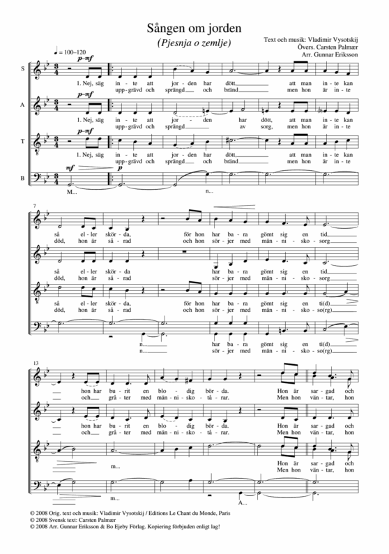 Visa av legendariske ryske sångaren och kompositören Vladimir Vysotskij i arrangemang för kör av Gunnar Eriksson. Svensk text av Carsten Palmær.