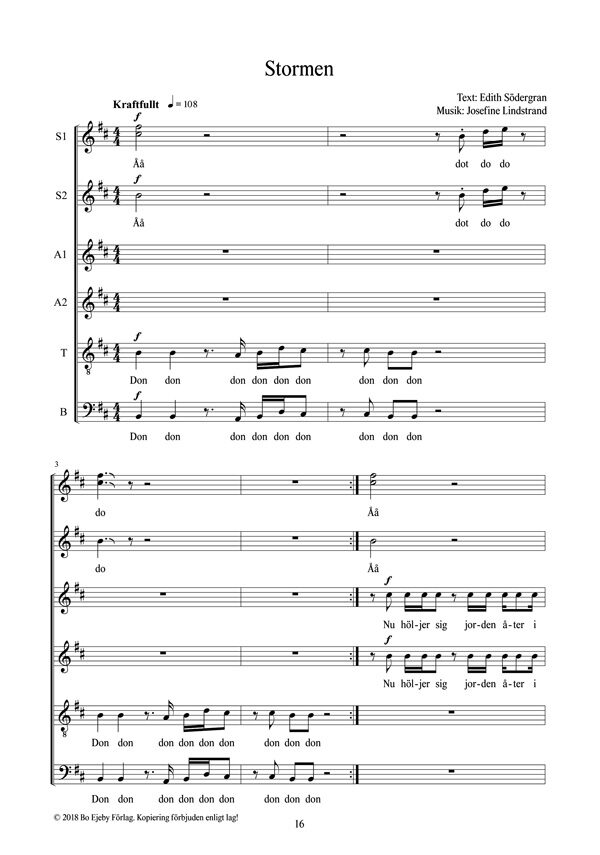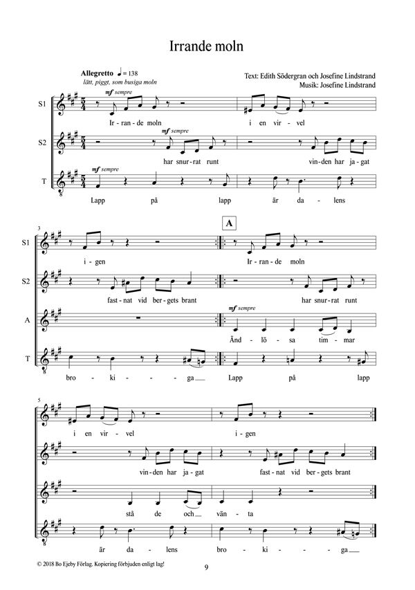 Josefine Lindstrand skriver: ”Edith Södergrans dikter har alltid fascinerat mig. Jag får en känsla av både nyfiken lekfullhet och samtidigt mörkt vemod och djup. Jag valde ut fyra dikter som jag tycker hör ihop på något sätt och valde att göra det till en körsvit för blandad kör. Dikterna och musiken beskriver fyra olika känslolägen eller sinnesstämningar i naturen och inom oss. Verket kan gärna framföras tillsammans med en improvisationsmusiker.”