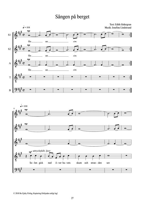 ”Songs from the mountain”. The Finnish-Swedish poet Edith Sodergran with her expressionist poetic diction has attracted many composers. Josefine Lindstrand has for her suite Songs from the Mountain selected four poems from the 1916 collection Poems and from the Rose Altar (1919). These are poems of a varied nature, but all with Nordic nature as a background.