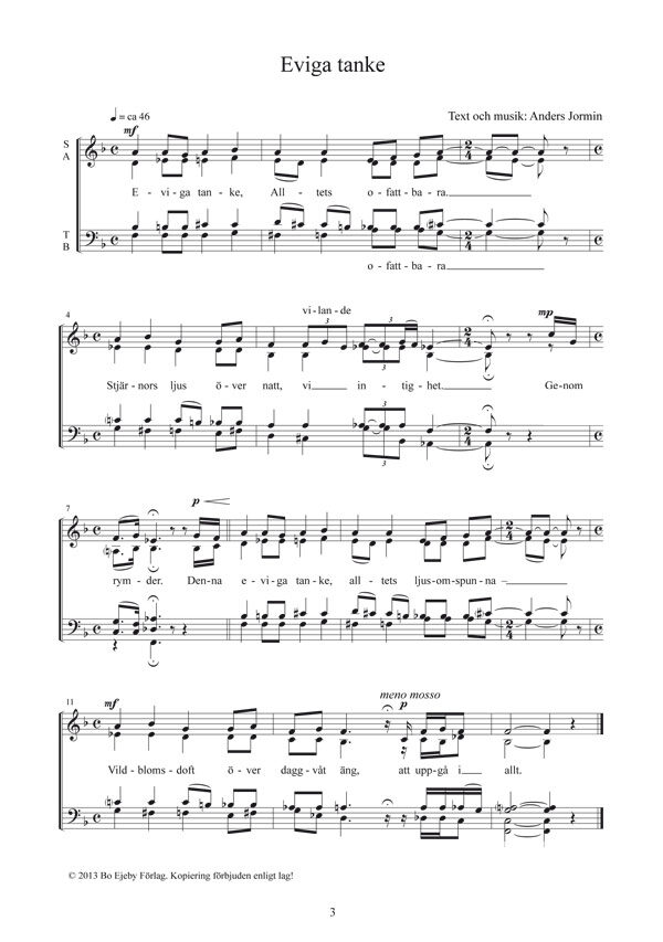 Six songs for choir a cappella from an oratorio called ”Between always and never”. Anders Jormin is a world famous double bass player and composer.