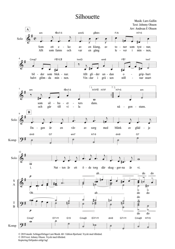One of celebrated jazz saxophonist Gullin’s most beautiful songs, in an arrangement for mixed choir and optional accompaniment. The text has a nightly and dream-ish tone.