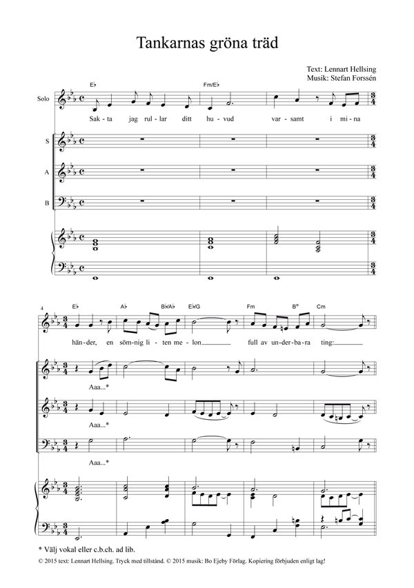 En av Stefan Forsséns många vackra sånger för kör, här i ett arrangemang för soloröst, trestämmig kör och piano.