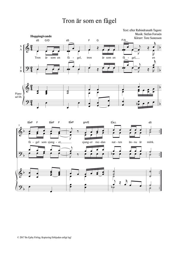 ”Faith is like a bird”. Originally a song by jazz pianist Forssén, here arranged for mixed choir and accompaniment ad lib. Lyrics by 1913 year’s winner of the Nobel Prize in Literature Tagore.