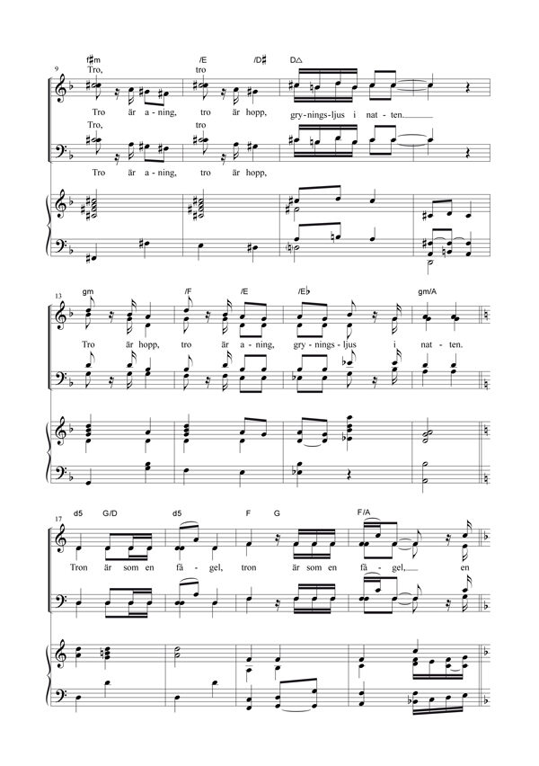 I Stefan Forsséns samling God morgon, ögonblick! fann Tore Sunesson sången Tron är som en fågel och arrangerade den för blandad kör. Pianoarrangemanget – som kan användas ad lib – är Forsséns eget.