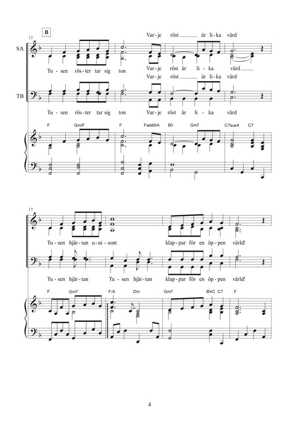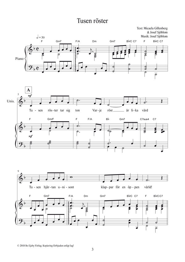 ”A thousand voices”. A song about an equal and united world. Could be sung by mixed choir or only the upper voices, simply by excluding the lower parts.
