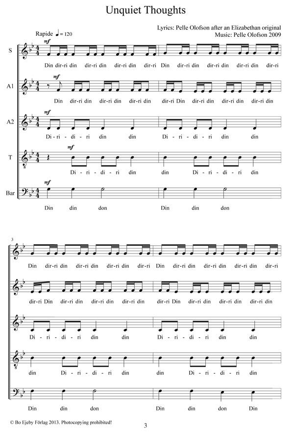 Texten är inspirerad av ett elisabetanskt original, och musiken har ett snabbt, lut-artat ackompanjemang. Ett stycke som bör tilltala både en ungdomlig och en mer mogen ensemble.