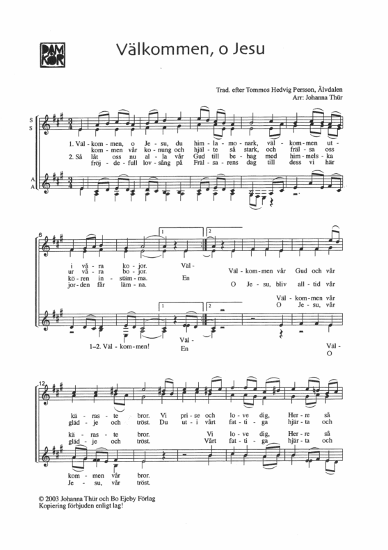 Melodi efter Tommos Hedvig Persson, Älvdalen i arrangemang för damkör av Johanna Thür, kyrkomusiker i Hagakyrkan i Göteborg och dirigent för damkören Ymna. Nedan kan du lyssna på deras inspelning av låten, från albumet Allt för vår ljusa stjärna. Här även tillsammans  med folkgruppen NID.