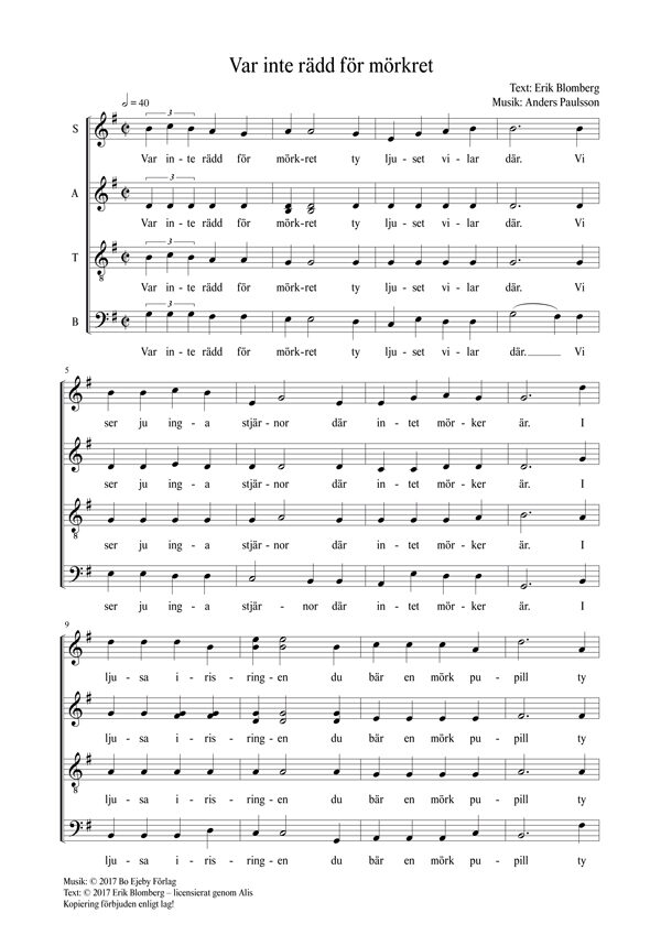 Erik Blombergs berömda dikt i tonsättning av Anders Paulsson kan sjungas i meditativ Taizé-tradition, där körsång, instrumentalverser, solosång, och kör con bocca chiusa varvas i valfri ordning.